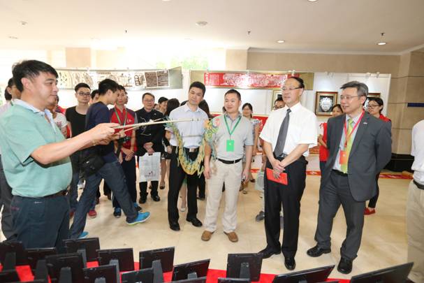 领导嘉宾饶有兴致地观看非遗展区的艺术表演
