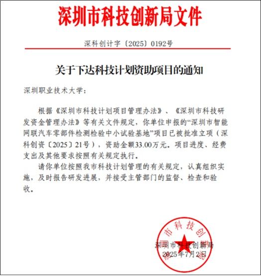 7月2日,接深圳市科技创新局通知,我校申报的深圳市中小试基地“深圳市智能网联汽车零部件检测检验中小试验基地”正式获批立项。