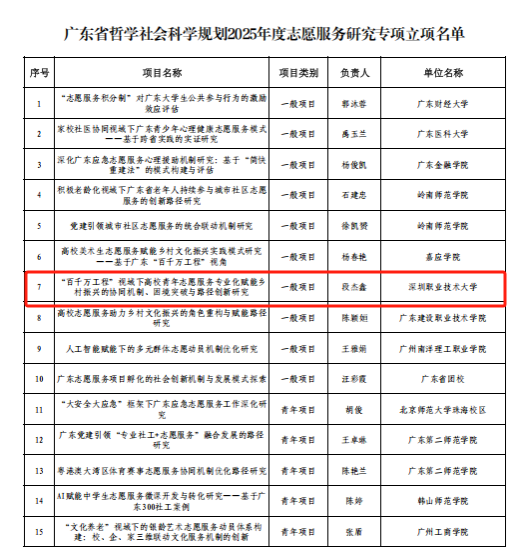8月8日,广东省哲学社会科学规划2025年度高校思想政治理论课研究专项和志愿服务研究专项立项名单发布,我校各喜获1项立项。其中,高校思想政治理论课研究专项全省共立10项,我校申报5项,立项1项(负责人为马克思主义学院姜英华),立项率为20%;志愿服务研究专项全省共立15项,我校申报2项,立项1项(负责人为食品药品学院段杰鑫),立项率达50%。(科研处郑艳/文)